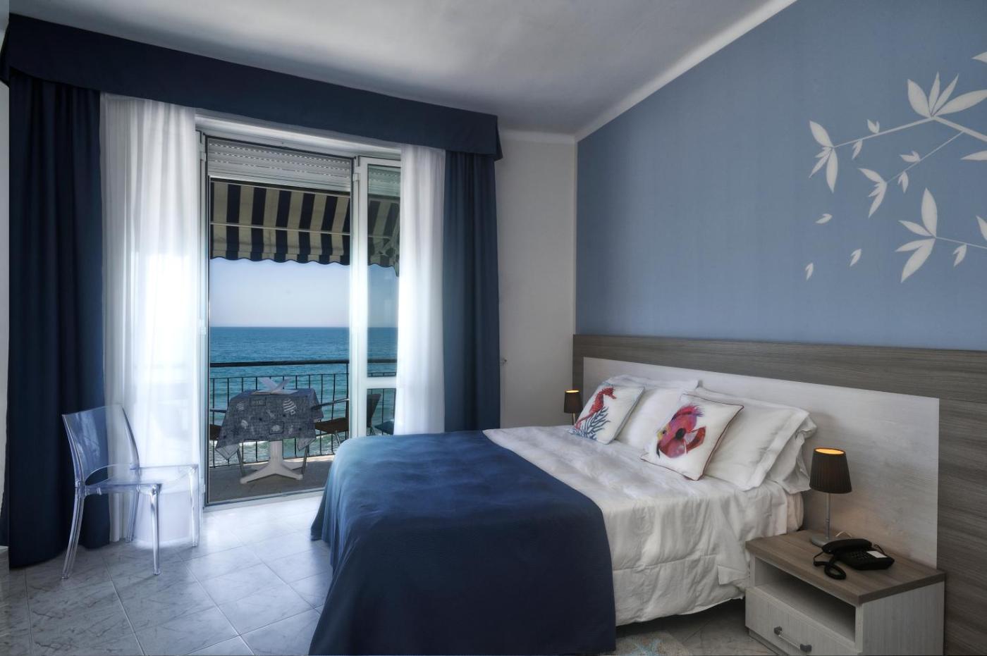 Camera MatrimonialeDoppia con Letti Singoli con Vista Mare. Camera con bagno interno dotata di cassaforte, minibar e TV con canali di calcio e cinema Mediaset Premium. Dispone di balcone con vista sul mare. ;