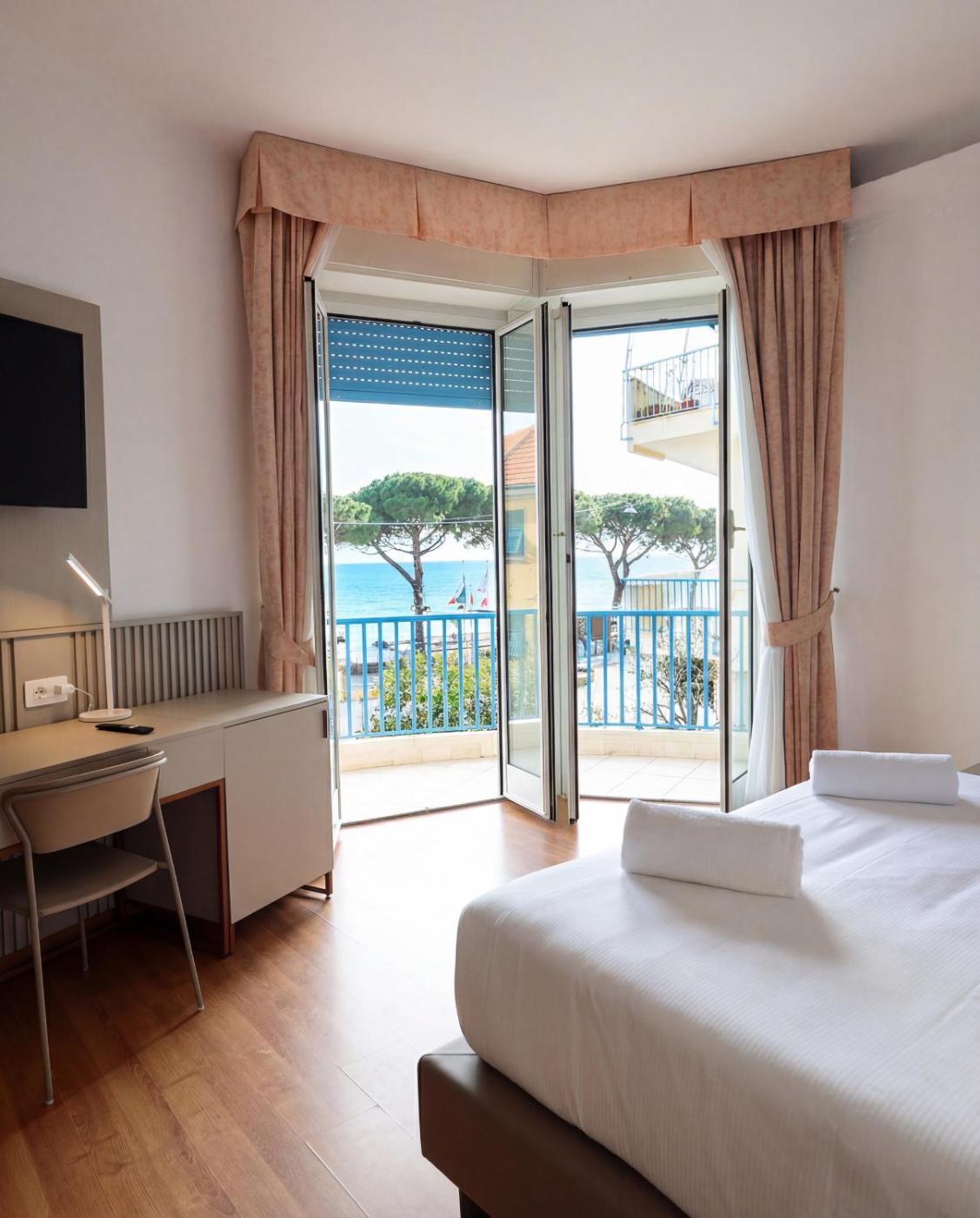 Camera Deluxe con Vista Mare. Camera matrimoniale climatizzata con TV satellitare, bagno privato e balcone vista mare. ;