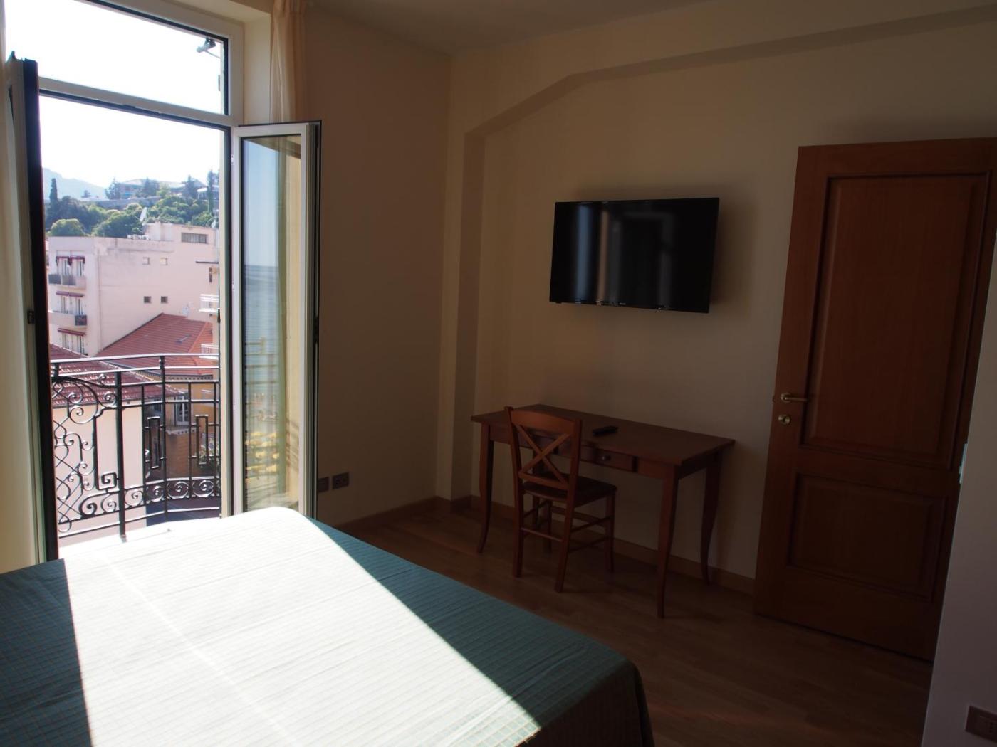 Monolocale familiare con vista mare parzialelaterale. Monolocale climatizzato con vista laterale sul mare. L’angolo cottura è dotato di microonde.